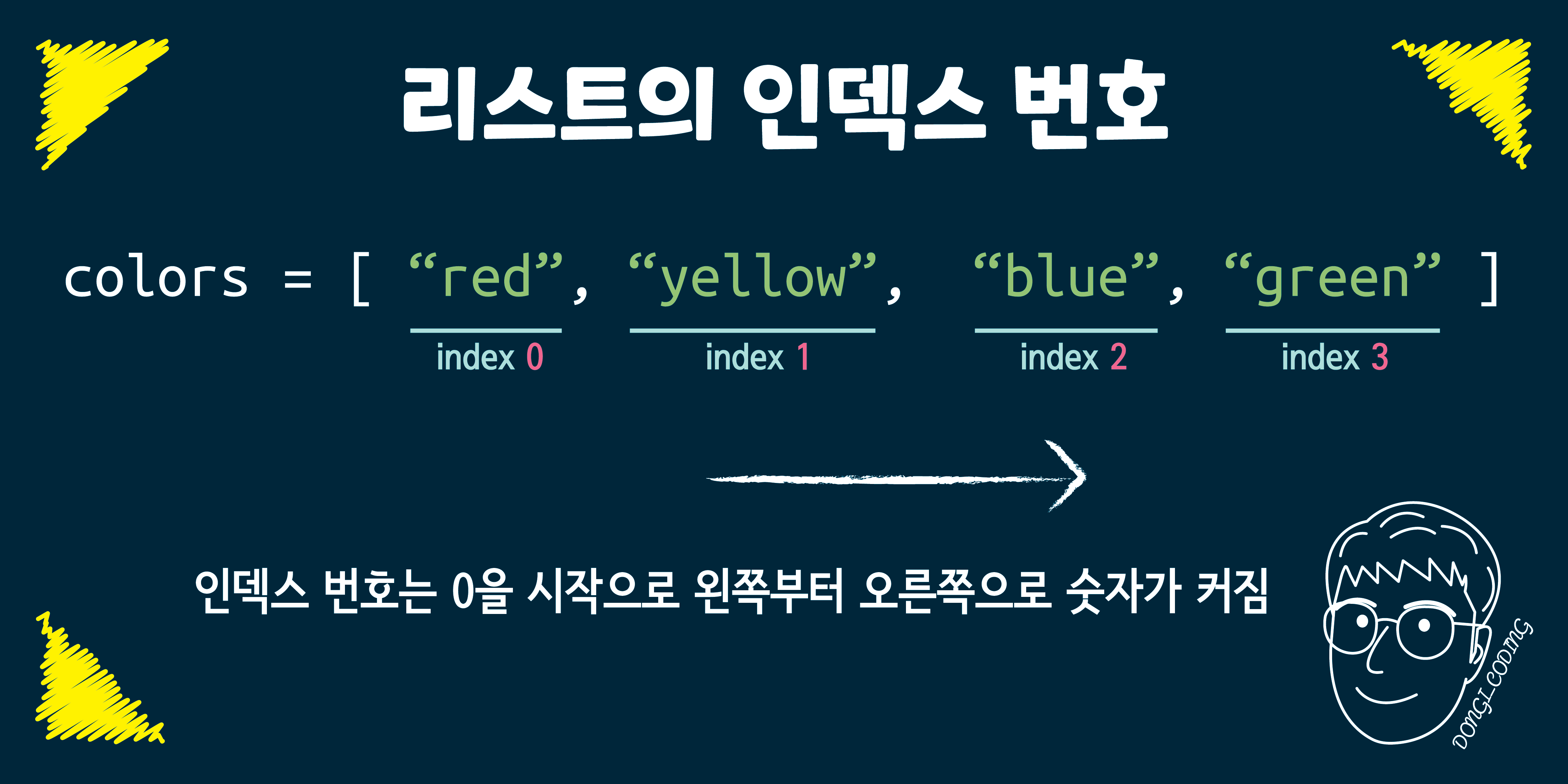 리스트를 자세히 알기 위해서는 인덱스가 무엇인지 확실히 알아야 합니다. 인덱스는 리스트의 요소들이 가지고 있는 고유의 번호인데요, 인덱스의 번호는 왼쪽부터 0으로 시작합니다.