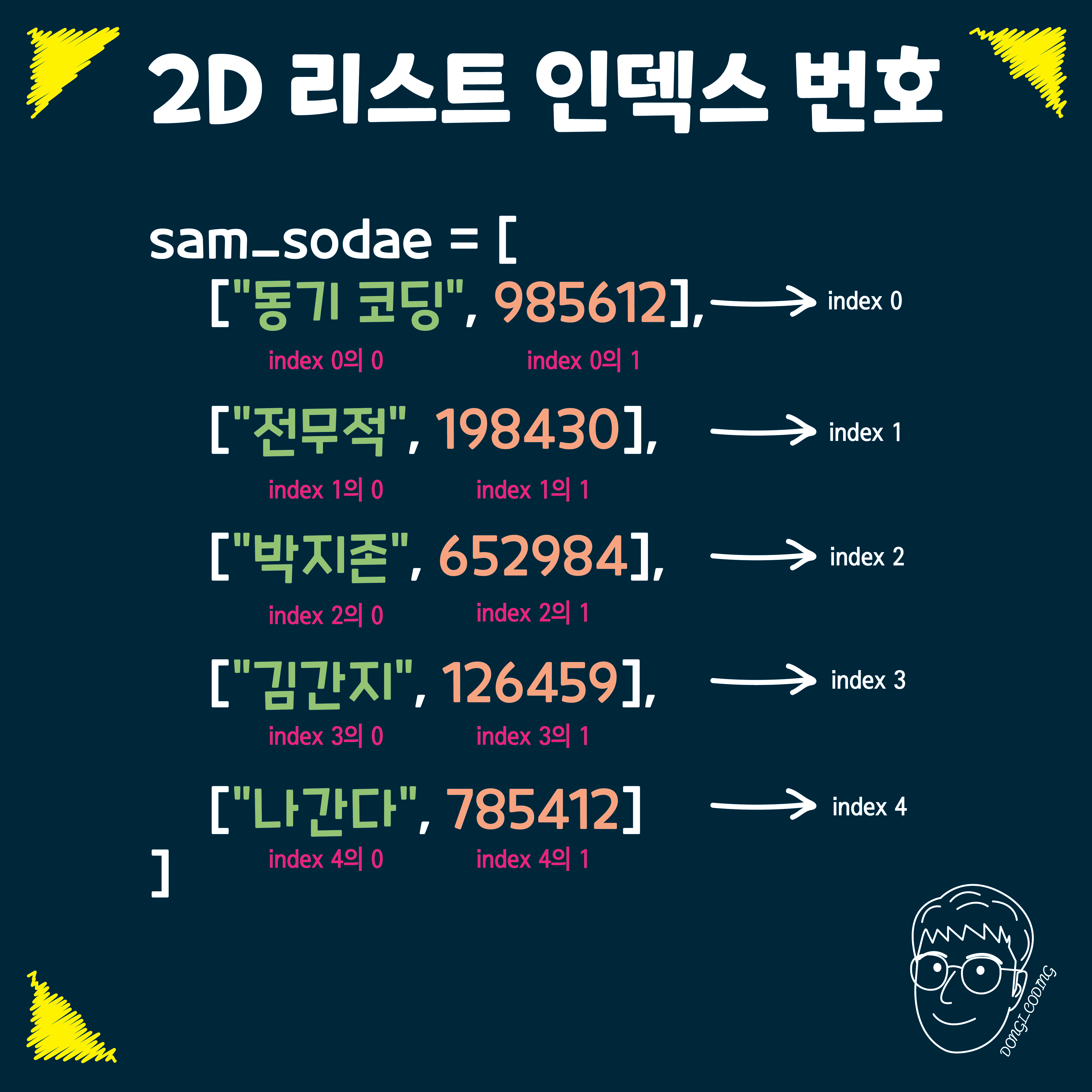 - 리스트를 크게 보면 "동기코딩", 985612가 인덱스 0인 리스트입니다. 그리고 그 안에 "동기 코딩"은 인덱스가 0 그리고 985612는 인덱스가 1입니다. "동기 코딩"을 코드로 표현하면 sam_sodae[0][0]이 되는 것입니다.