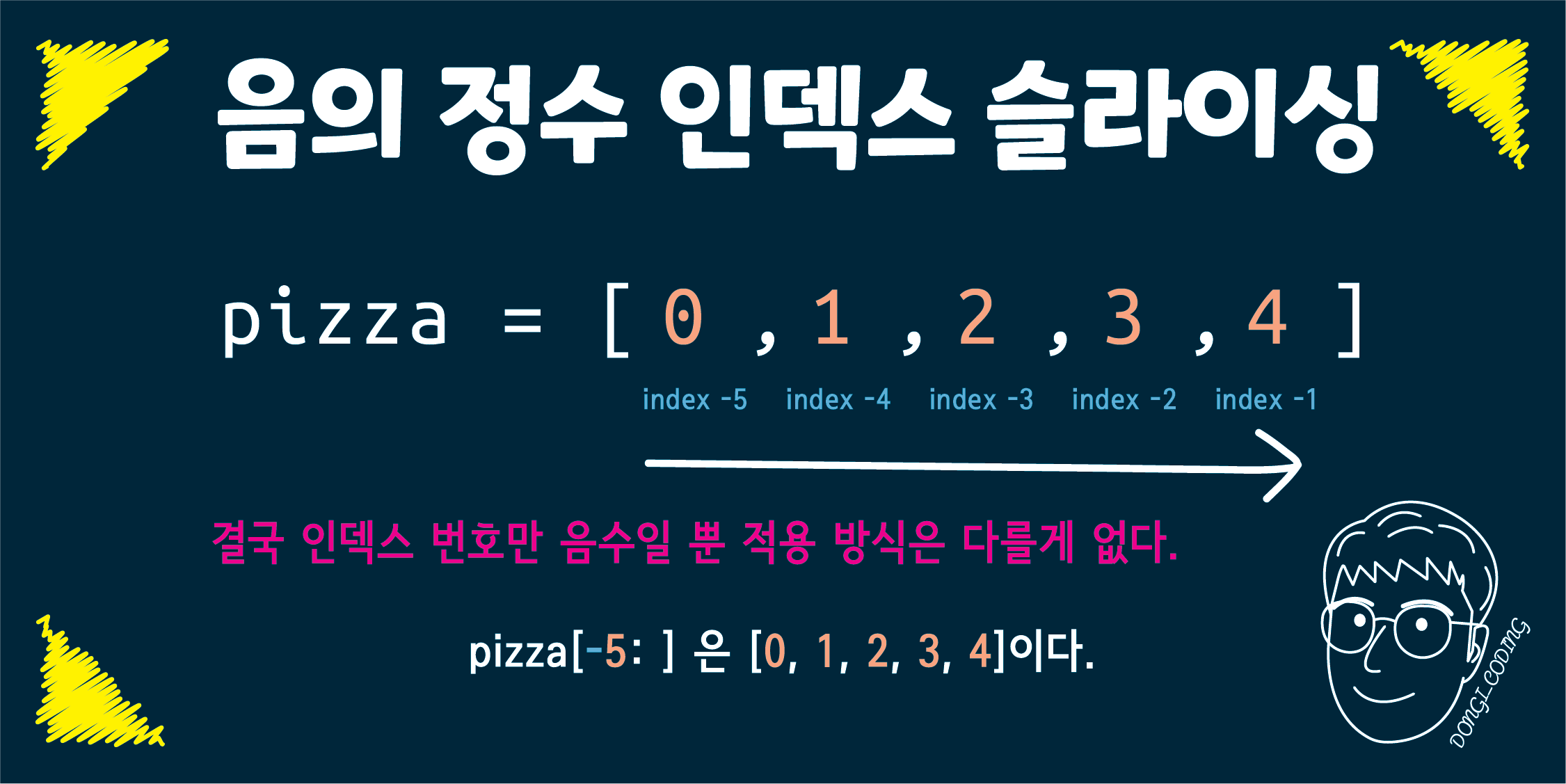 오늘은 인덱스 번호가 음의 정수일 때 슬라이싱을 하는 방법에 대해 알아봅시다!