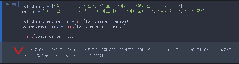 위의 코드와 같이 새로운 변수를 만들어주고 거기에 zip() 함수를 사용하고 독립변수로 리스트 lol_champs와 region을 넣어주고 출력을 해보겠습니다!