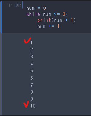 - 행동으로 num을 출력한 다음 num은 반복문이 반복될 때마다 1씩 증가하도록 num += 1로 설정해줍니다.