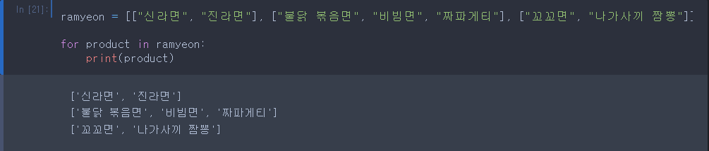 - 첫 번째 코드에서 product는 ramyeon안에 있는 요소 ["신라면", "진라면"], ["불닭 볶음면", "비빔면", "짜파게티"], ["꼬꼬면", "나가사끼 짬뽕"]을 하나씩 뽑아옵니다. 그런데 사실 이 요소들도 또 다른 리스트로 이루어져 있죠!