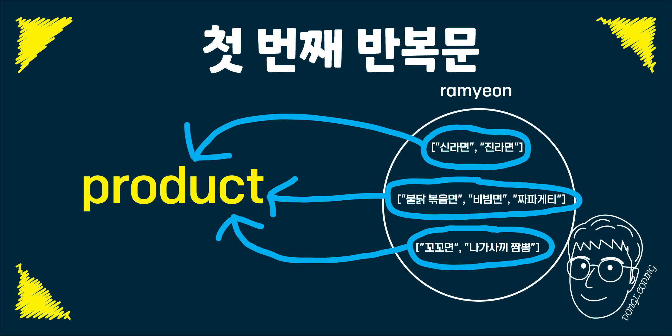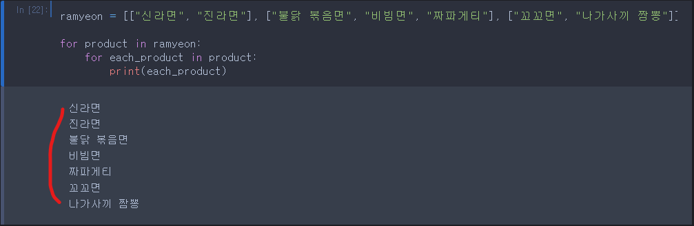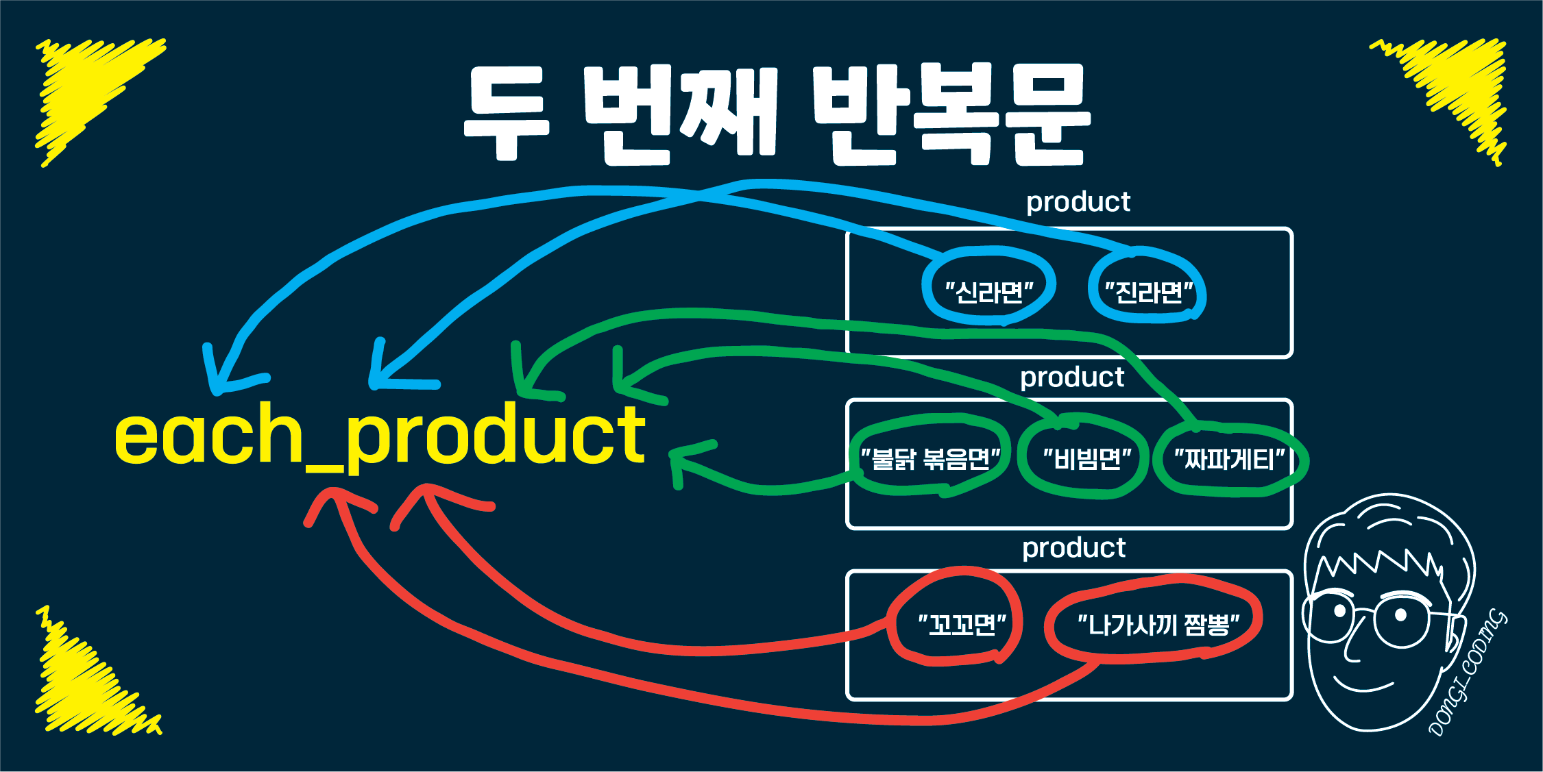 - 두 번째 코드에서 each_product는 product안에 있는 요소 "신라면", "진라면", "불닭 볶음면", "비빔면", "짜파게티", "꼬꼬면", "나가사끼 짬뽕"을 하나씩 뽑아옵니다.