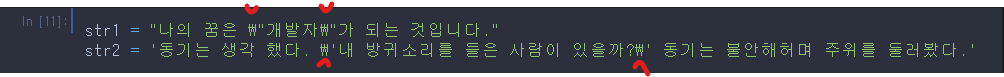 주피터 노트북에서 문자열이라면 초록색 글씨로 나와야 하는데 개발자와 내 방귀소리를 들은 사람이 있을까? 는 흰색으로 나타났습니다. 신텍스 에러가 떴는데요, 이럴 때는 백 슬레쉬(back slash) 또는 대한민국 화폐단위를 해당 큰따옴표와 작은따옴표 앞에 붙여주면 됩니다. 이 버튼은 엔터키 위에 있습니다.