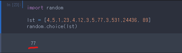 random.choice()는 독립변수로 리스트를 받는 함수인데 리스트의 요소중에 한 숫자를 랜덤으로 뽑아서 값으로 되돌려줍니다.