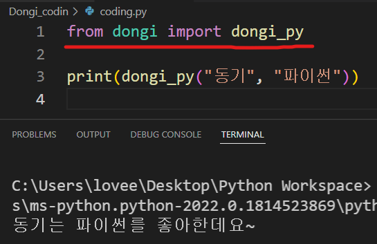 - 위와 같이 코드를 써준다면 컴퓨터가 '아하 얘가 dongi안에 있는 dongi_py를 가져오고 싶구나 그럼 줘야지'하고 함수를 사용할 수 있게 해 줍니다.