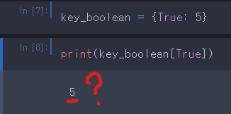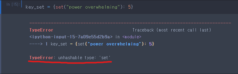 키로 올 수 있는 타입(Hashable Type)은 문자열, 숫자, 실수, 튜플, 불린이 올 수 있다. 올 수 없는 타입(Unhashable Type)은 리스트, 딕셔너리, 셋은 올 수 없다.
