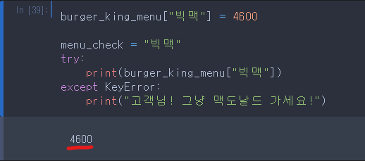 - burger_king_menu["빅맥"]을 출력해보는데 (해보는 시도 = try)