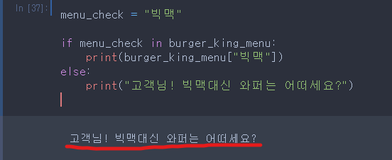 - 만약 menu_check가 buger_king_menu에 있다면 :
