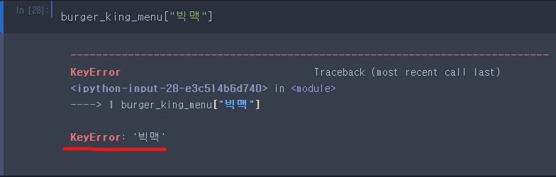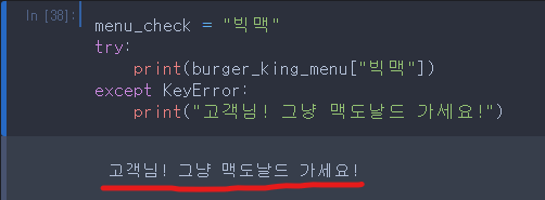 어허... 맥도날드 빅맥을 찾으니까 KeyError: '빅맥'이라고 뜨네요! 그런데 문제는 이렇게 되면 프로그램이 에러 때문에 멈춰 버린다는 것이죠! 그래서 if문을 이용하여 에러를 피해 가는 방법이 있습니다.