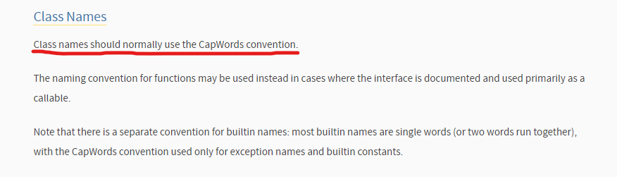 - class라고 써주시고 클래스명을 쓰면 되는데 첫 글자를 소문자로 써도 사용이 가능하지만 Python Naming Conventions에 보면