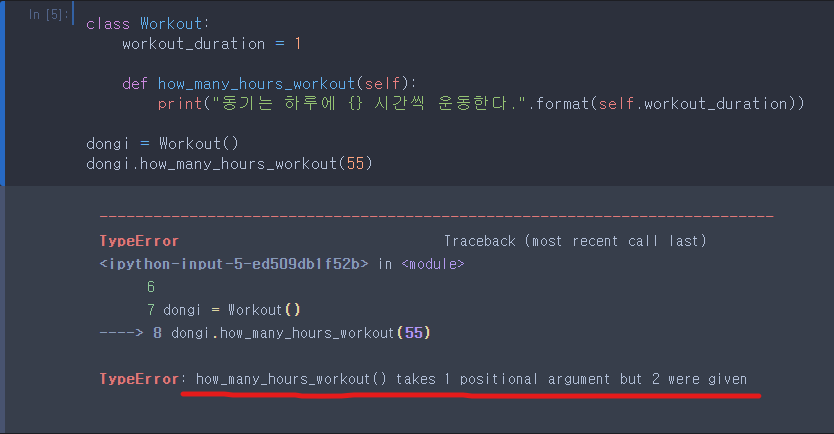 - 메서드를 실행하는데 만약 self에 다른 인자를 넣게 되면 인자가 두 개가 들어왔다면서 에러를 줍니다.