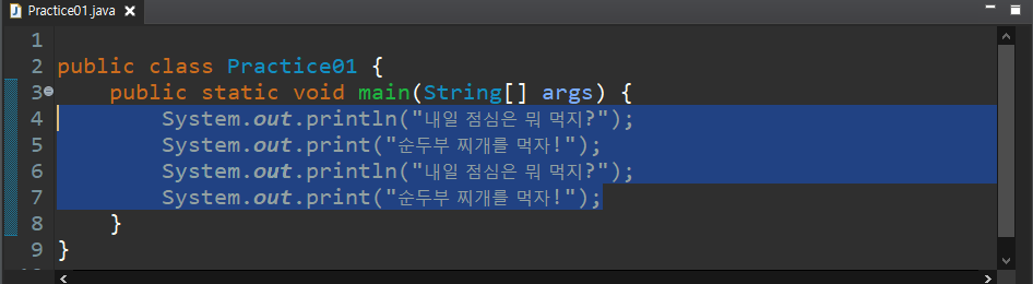 가장 많이 사용되는 출력문이 System.out.println();이 아닐까 싶다. 아마 파이썬을 해보신 분이라면 print면 print지 println은 뭐야?라고 생각이 들 수 있는데 ln은 바로 line의 약자이다. 한 줄을 땋 출력해주고 줄을 바꾸어 준다.