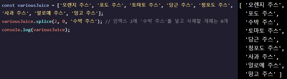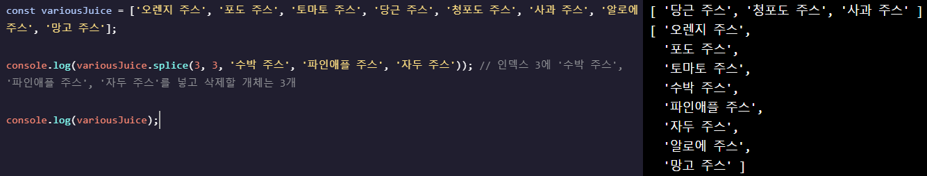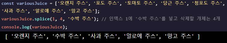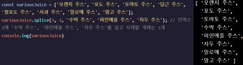 만약에 console.log(variousJuice.splice(3, 3, '수박 주스', '파인애플 주스', '자두 주스');를 실행해 본다면?