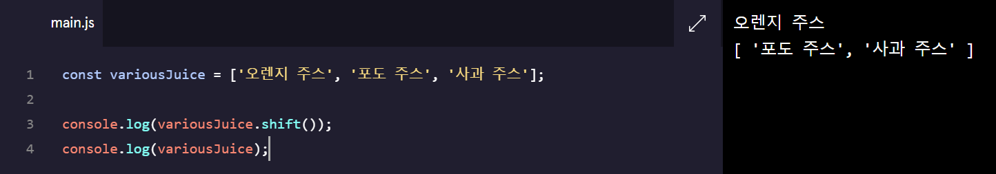 .shift() 메서드는 배열(Array)에 있는 첫 번째 객체를 빼내어 줍니다.