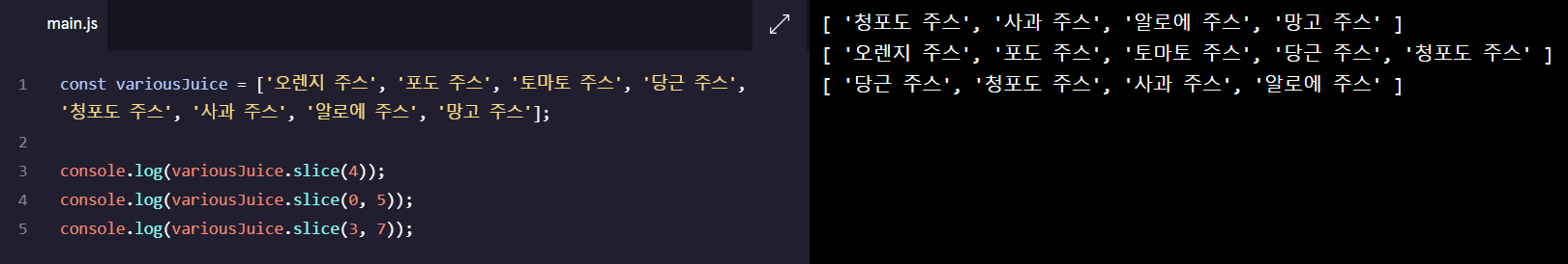 두 번째 출력문을 보시면 마지막 인덱스 번호가 5라서 '사과 주스'까지 출력이 될 거 같지만 인덱스 번호가 4인 '청포도 주스'까지만 출력이 되는 것을 확인할 수 있습니다.