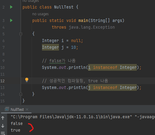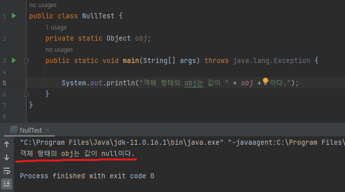 자바에서 null은 문자 그대로 null로 표현 해야한다. 왜냐하면 대소문자 구별을 하기 때문! C언어처럼 NULL이나 0으로 사용할 수 없다.
