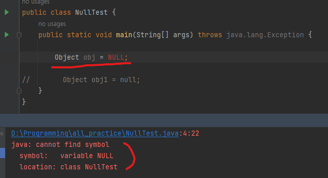 NULL이라 선언한 obj는 심볼을 찾을 수 없다고 에러가 뜬다!!!