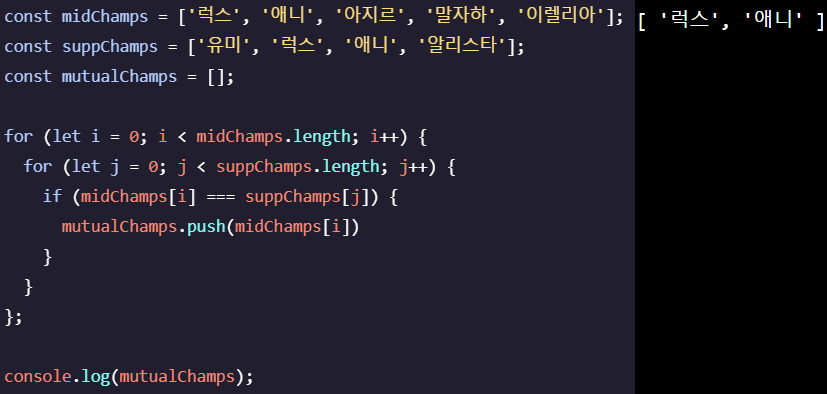 리그오브레전드의 미드 챔프 5명과 서폿 챔프 4명의 배열(Array)을 선언해준뒤에 미드와 서폿 모두 사용되는 챔프를 선별해 중복 챔프 배열에 넣어보도록 하겠습니다!