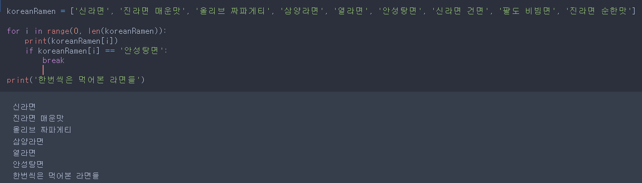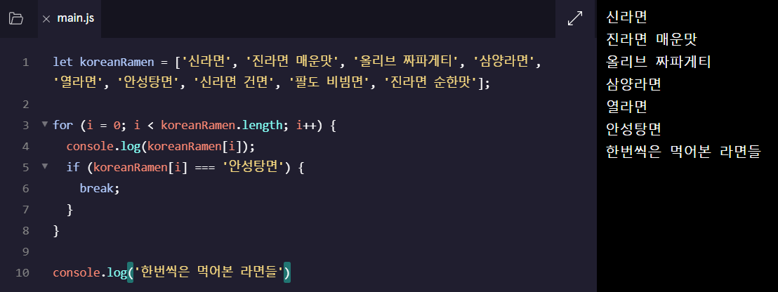 - if 만약 (koreanRamen[i]가 '안성탕면') 이라면 (koreanRamen[5]에서 '안성탕면'과 같아지니까)
