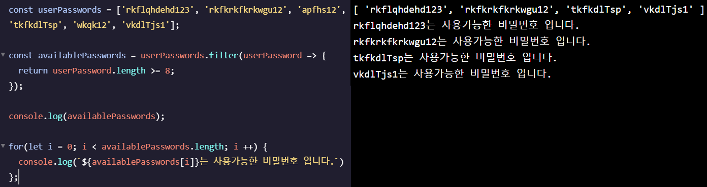 - .filter() 메서드로 새롭게 태어난 availablePasswords를 출력해봅니다.