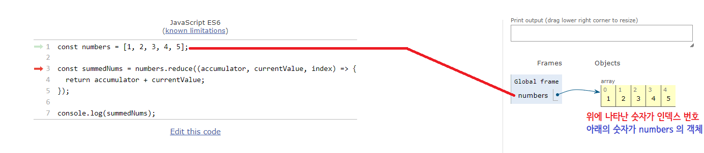 - 누적값은 누적값 더하기 현재값 입니다. (숫자들 배열의 객체 수만큼 반복됩니다)