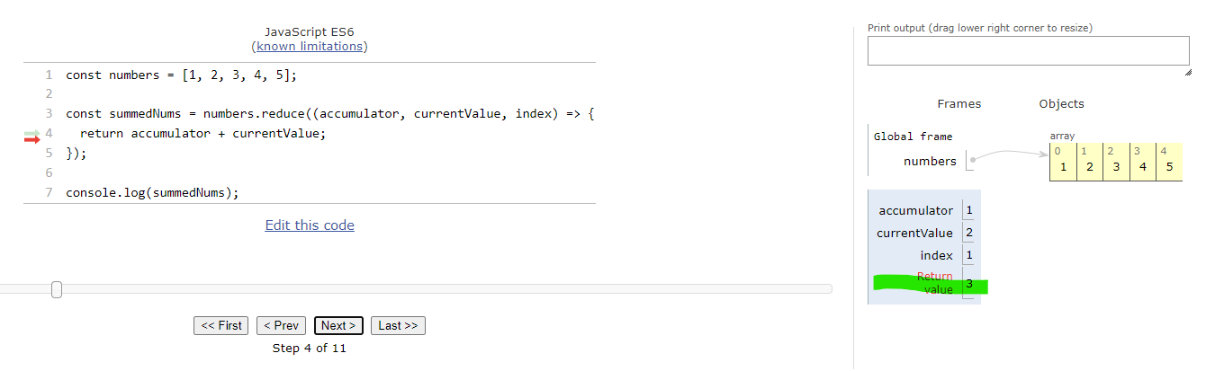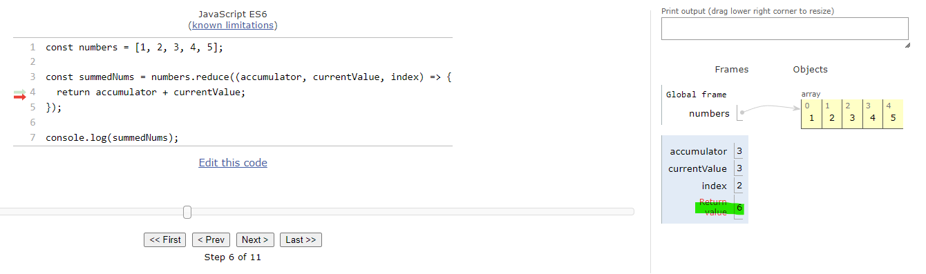 - 리턴 값이 6이 나옴. 이제 이 코드가 인덱스 4까지 반복되면 우리가 summedNums의 값이 나옵니다.