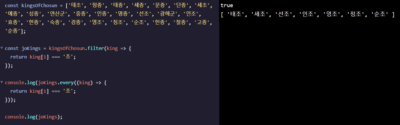3. 마지막으로 .every() 메서드를 사용해 모든 객체의 두 번째 글자가 '조'를 가지고 있는지 확인해보고 새로 만든 배열로 출력해보겠습니다.