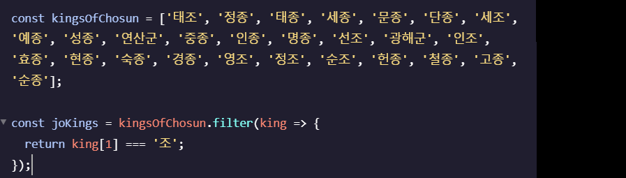 2. 지난 시간에 배운 .filter() 메서드를 사용해 묘호에 '조'가 들어가는 임금만 추려서 새로운 배열을 만들어 보겠습니다.