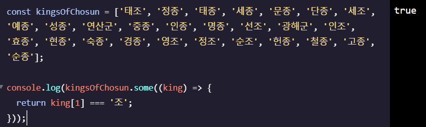 ● 조선의 왕들의 묘호에 두 번째 글자인 종, 조 중에서 '조'자를 가진 왕들을 추려내서 새로운 배열로 만들어 확인하는 코드를 만들어 보겠습니다.