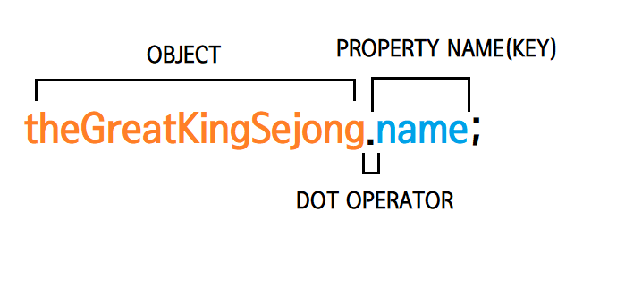출력문을 보면 theGreatKingSejong이 Object이고 . 이 Dot Operator 그리고 name이 Property name인 Key입니다.