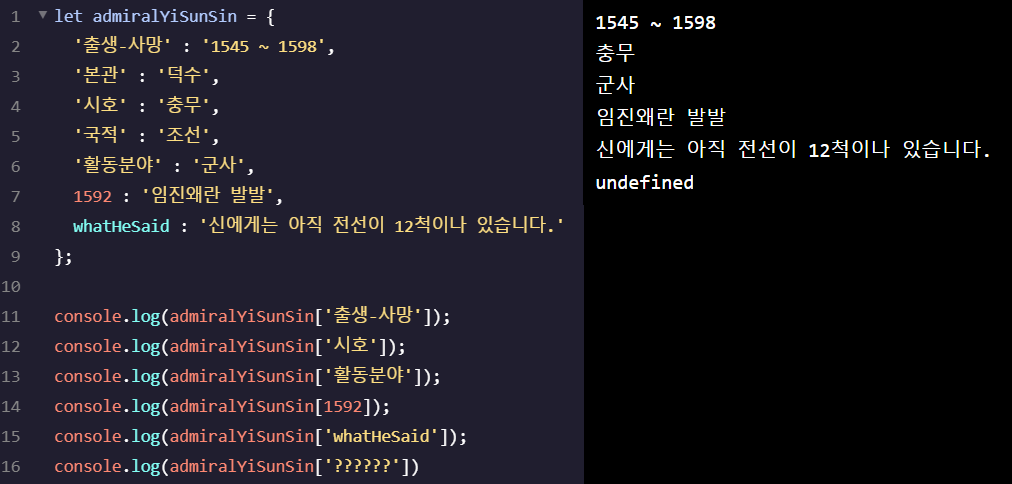 - 16번째 줄에 없는 Key값을 불러내어보니 undefined가 호출이 된 것을 확인할 수 있습니다.