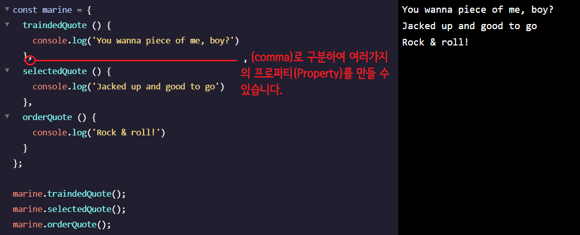 데이터(Data)를 객체(Object)에 담으면 그것이 함수(Function)가 되는데, 우리는 그걸 메서드(Method)라 부릅니다. 객체(Object)안에서 정해진 값을 프로퍼티(Property)라고 하는데 이는 작동 내용을 포함하는 의미이기도 하다.