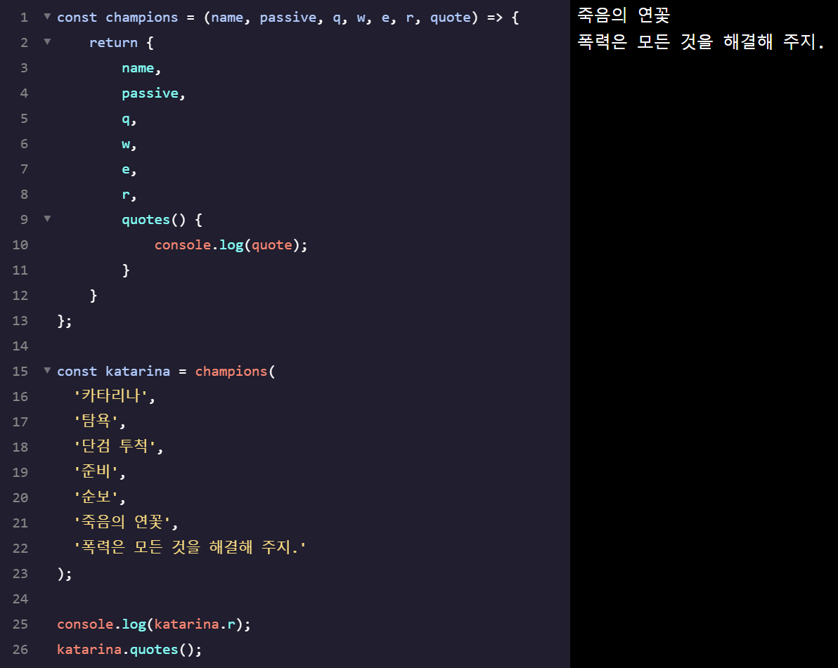 그리고 코드가 잘 작동하는지 알아보기 위해 console.log(garen.q);로 q 스킬을 출력해보니 결정타라고 나오고 garen.quotes();로 메서드도 작동을 해보았더니 내 검과 심장은 데마시아의 것이다!라고 잘 출력이 되어 나오는 것을 확인할 수 있습니다.