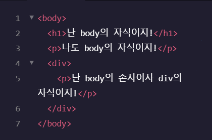 - <body>라는 가장 부모 요소(Element)가 있고 그 아래 <h1>과 <p>, <div>라는 자식들이 있습니다.