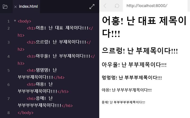 - <h1>은 대표 제목입니다. 이보다 작은 제목들은 모두 부제에 해당합니다.