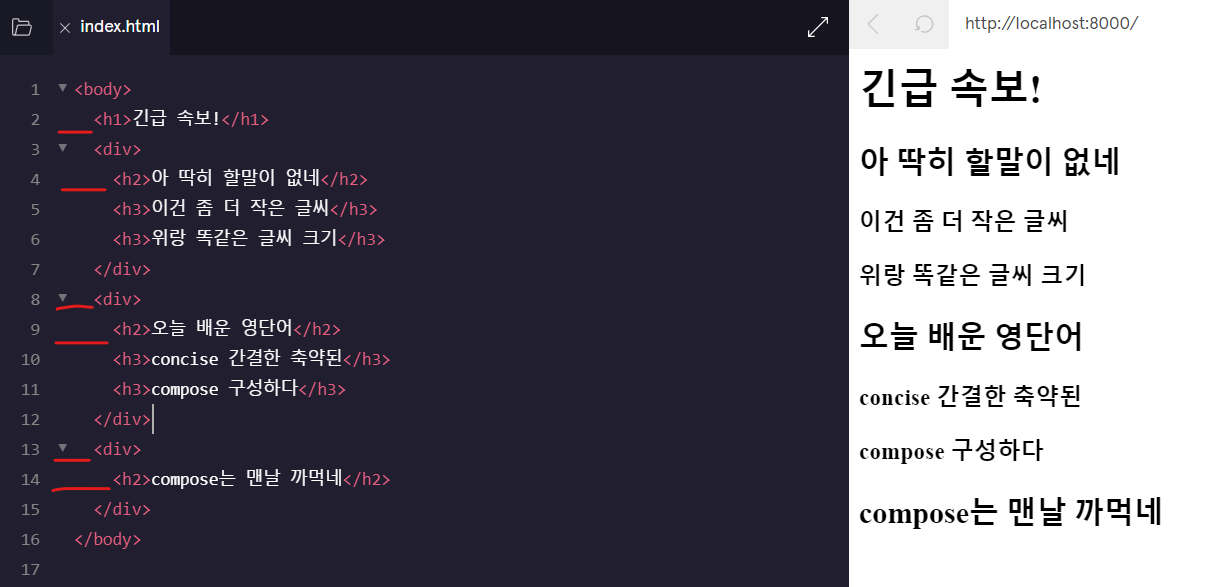 우리가 주목해야할 부분은 빨간 밑줄, 왜냐하면 들여 쓰기 때문인데요 <body>가 가장 부모 태그 그 안에 본 제목(<h1>)이 있고 그안에 <div>가 3개로 나누어져 있어 알아보기가 쉽습니다.