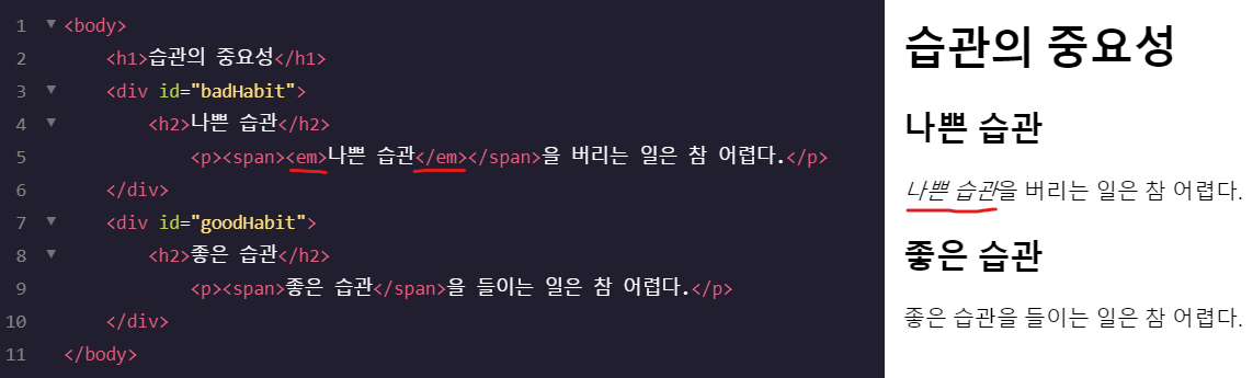 <em> 그렇습니다 emphasize의 줄임말이죠. 아래와 같이 사용을 합니다.