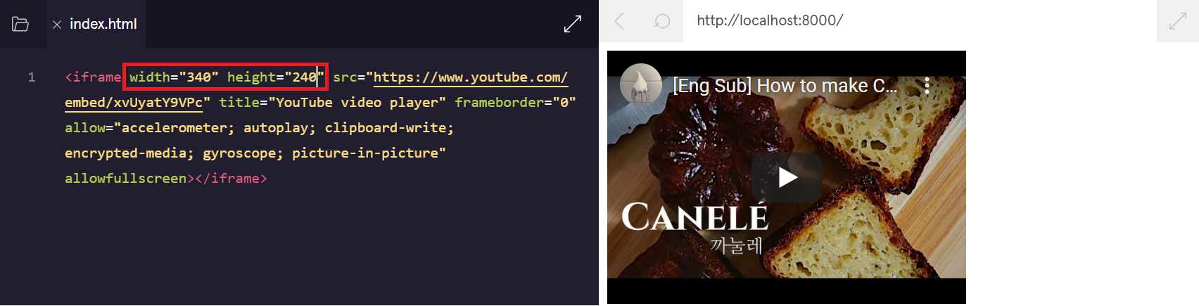 - width는 동영상의 가로 크기, height는 세로 크기를 나타냅니다. 최적에 동영상 크기를 알아보고 싶다면, 구글에 동영상 크기라고 검색하면 상세히 나와 있습니다.