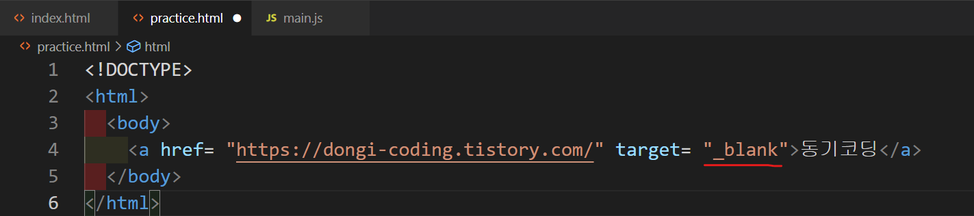 앞서 작동해본 예를 보면 링크를 클릭하니 본래의 창(window)에서 동기 코딩의 블로그 페이지가 나왔습니다. 여기서 타깃(Target) 속성을 사용한다면 다른 방식으로 링크를 열 수 있게 됩니다.