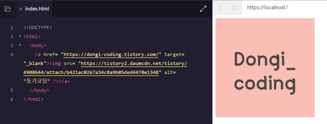 href에 동기코딩 블로그 주소를 넣고 target에는 새창으로 실행 src에는 이미지가 위치한 주소를 넣어주고 alt에는 동기코딩이라고 설명을 넣어 주었습니다.