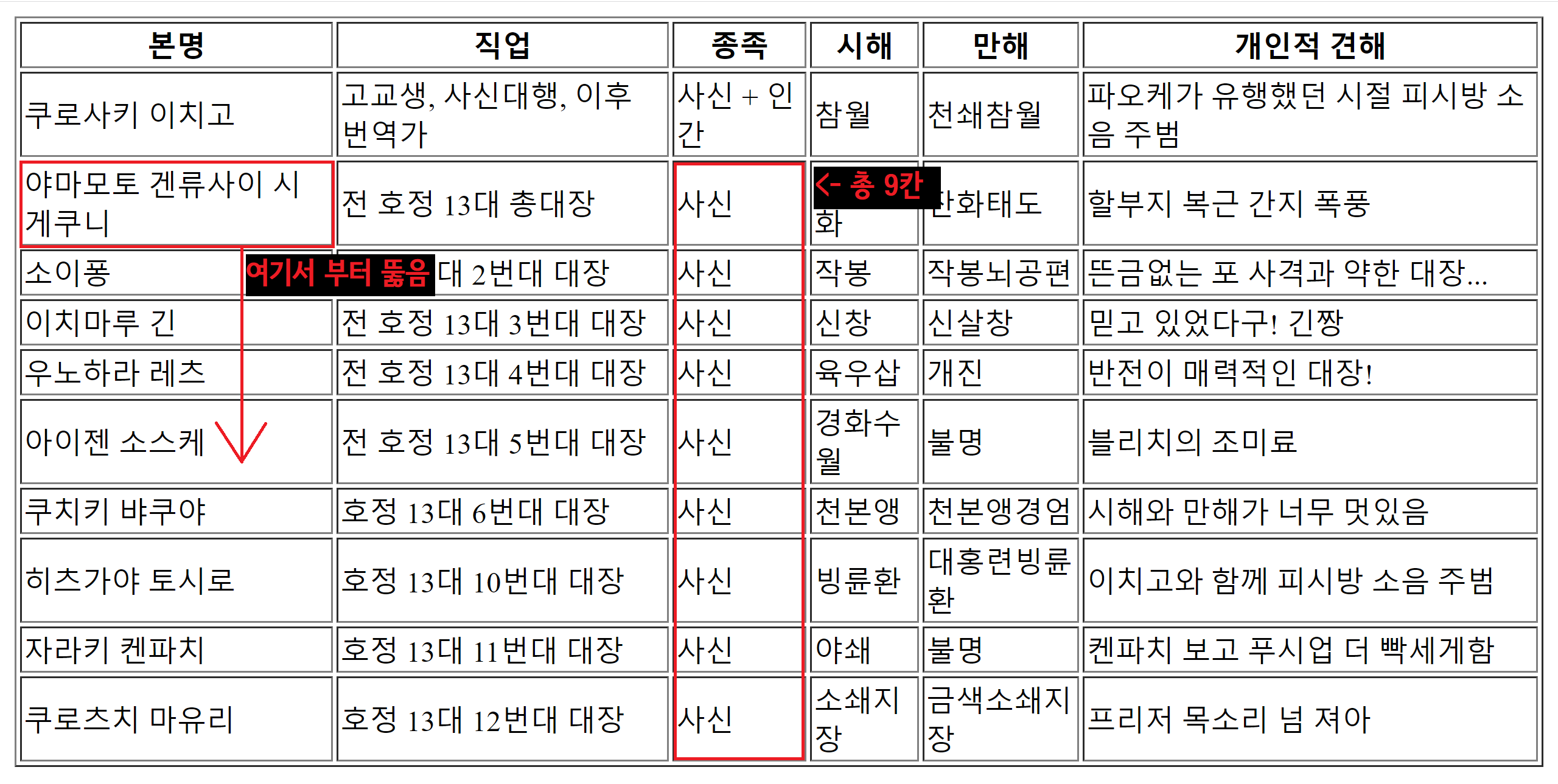 총 9칸을 뚫어주면 되니까 rowspan="9" 작성을 해주고 나머지 대장들의 "사신" 정보를 지워 줍니다.