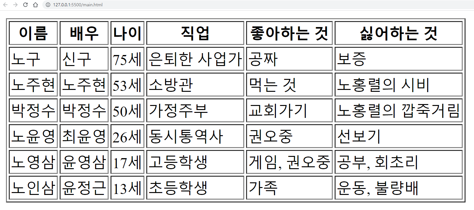 이제 한번 테이블 다운 테이블을 한번 만들어 보겠습니다. 요즘 최애 시트콤 '왠만해선 그들을 막을 수 없다'의 노주현 가족들에 대한 테이블을 만들어 보겠습니다.