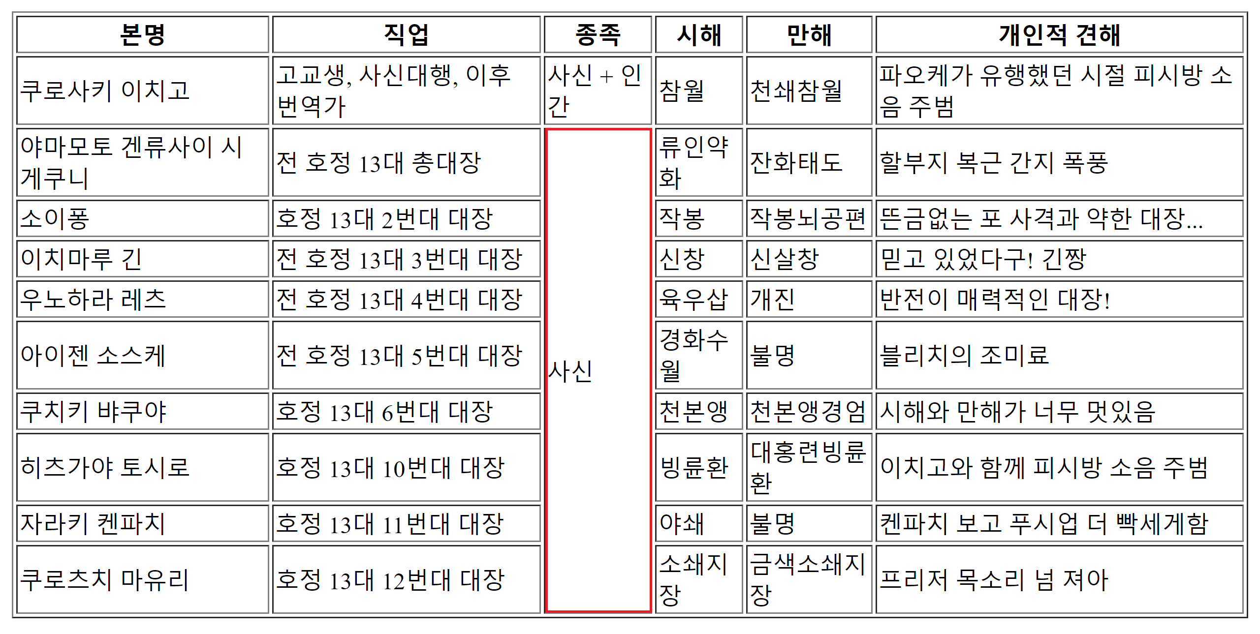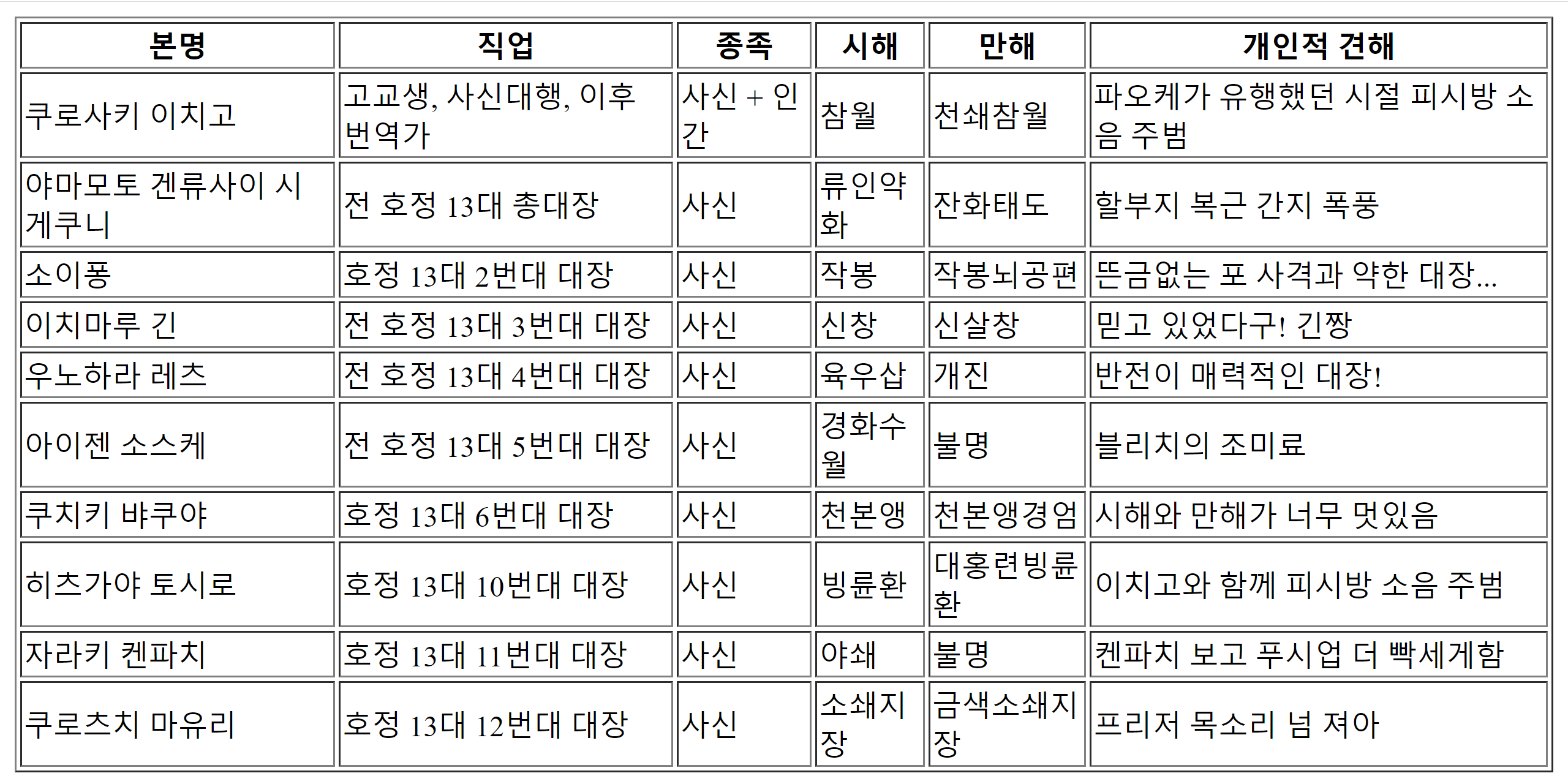 군대 있을 때 최애 애니메이션 블리치에 관해 테이블을 만들어 보겠습니다!